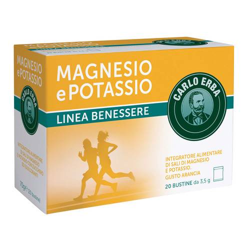 CARLO ERBA MAGNESIO e POTASSIO LINEA BENESSERE INTEGRATORE ALIMENTARE DI SALI DI MAGNESIO E POTASSIO. GUSTO ARANCIA Il Magnesio e il Potassio sono Sali Minerali considerati macro elementi, in quanto presenti nell'organismo umano in quantità relativamente alte: il fabbisogno giornaliero è superiore ai 100 g. Il Magnesio contribuisce al normale metabolismo energetico e alla riduzione di stanchezza e affaticamento. Il Potassio è importante per mantenere una normale pressione sanguigna. Con zucchero ed edulcoranti. Modalità d'uso 2 bustine al giorno. Versare il contenuto di una bustina in un bicchiere, aggiungere acqua ...